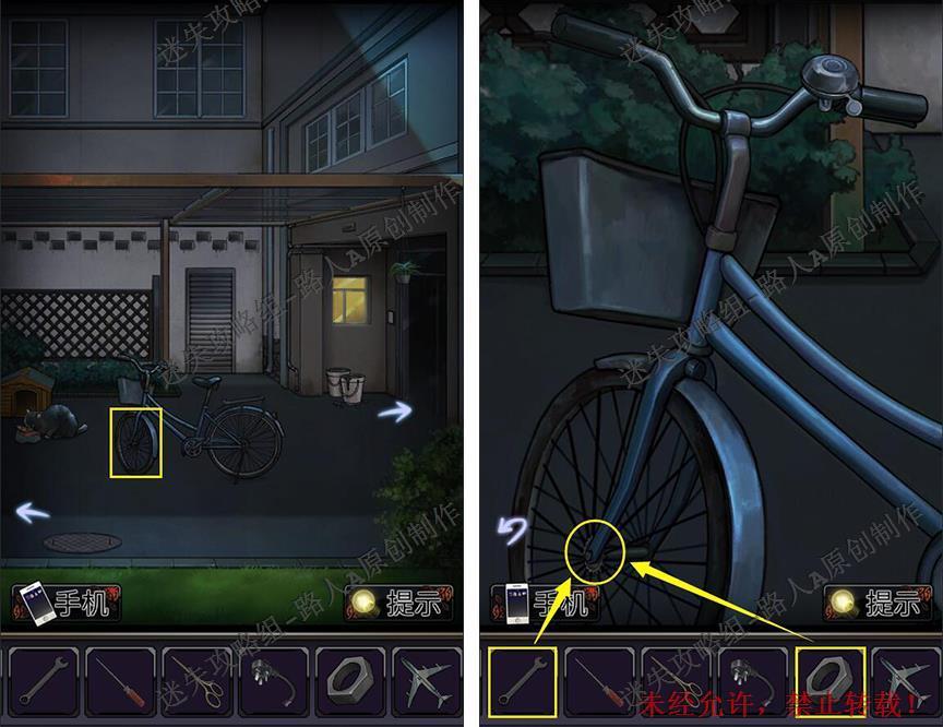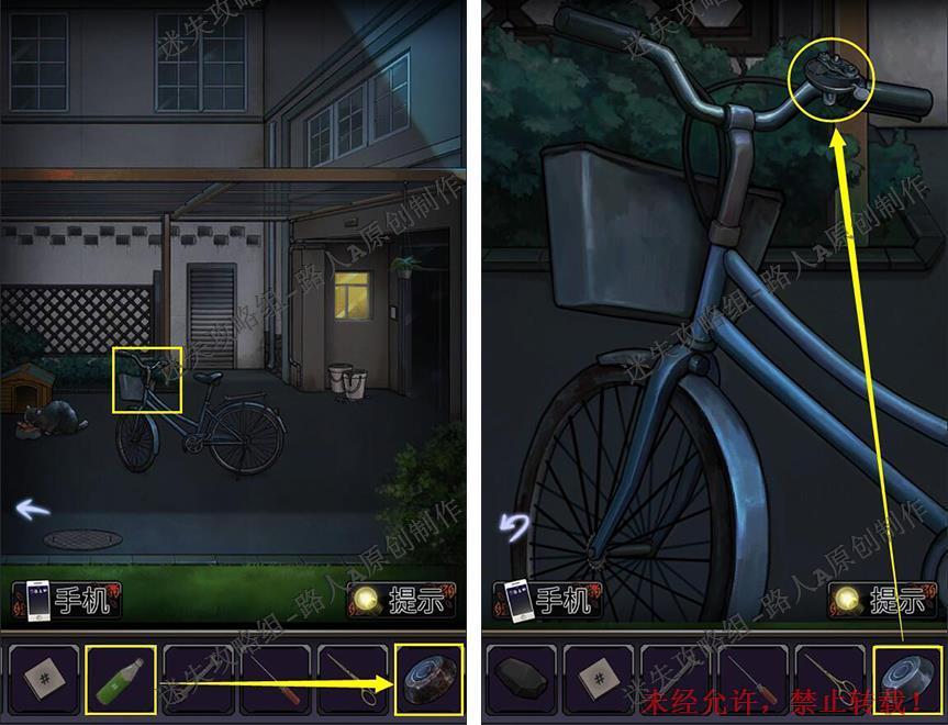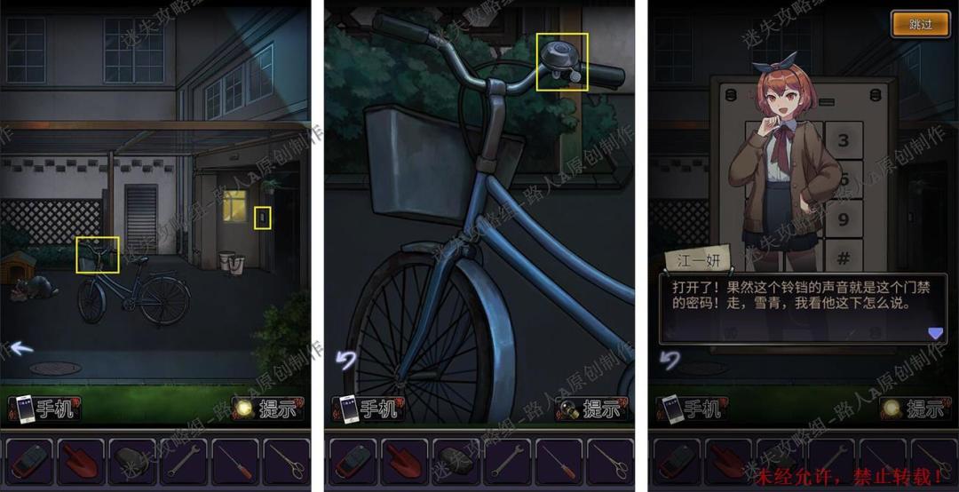 23. 点击自行车的车铃,可以听到4个音调,根据这个线索输入密码。(点击密码盘的按钮也能听到音调,仔细对比两边音调,找到和车铃一样的音调即可,输入密码后点击红色按钮。)23.1