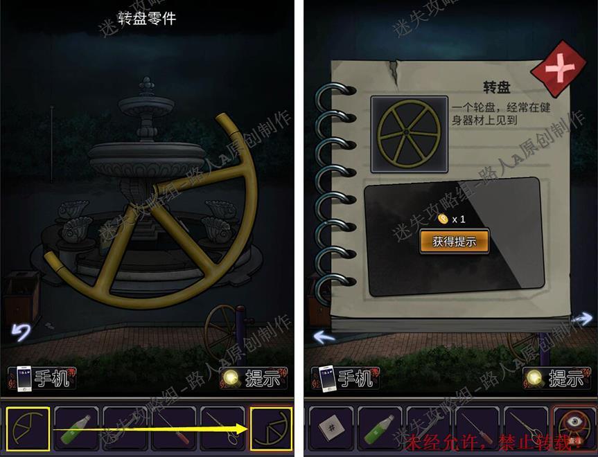 19. 将【转盘】安装到健身器上,转动转盘,得到【生锈的车铃盖】。19.1