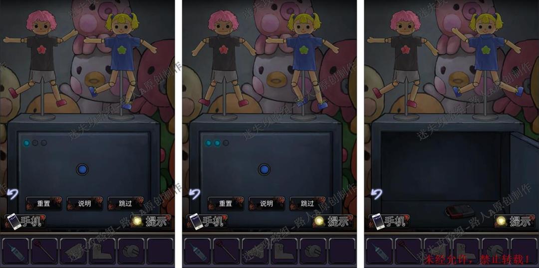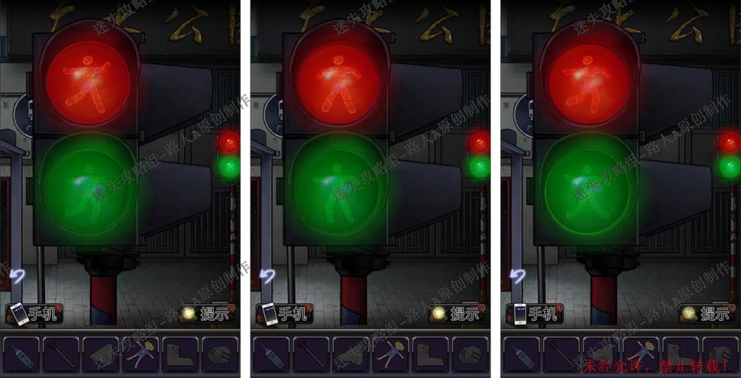 4. 根据红绿灯的线索,将【人偶】放入小摊的箱子上,调整人偶姿势,得到【车钥匙】。(需要调整3次人偶姿势,每次调整后,点击箱子中央的蓝色按钮,亮灯代表姿势正确。)4.1、4.2、4.3