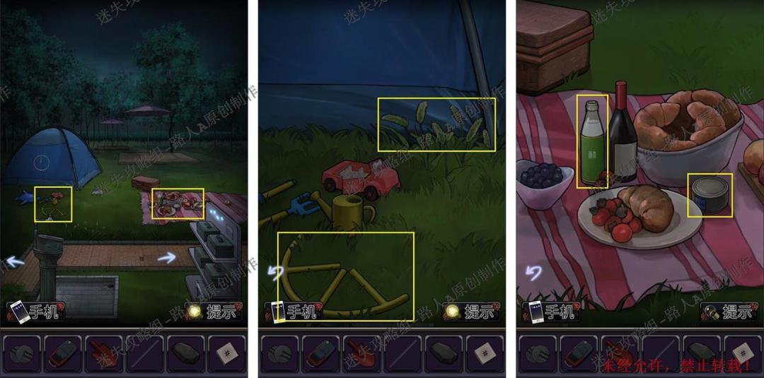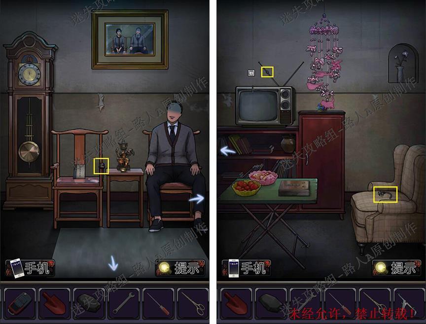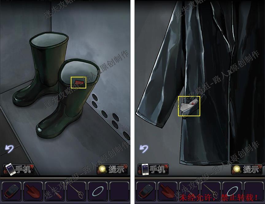 1. 拾取【机油】、【铲子柄】、2个【纸条碎片】、【人偶】、【旋钮】。1.1、1.2、1.3
