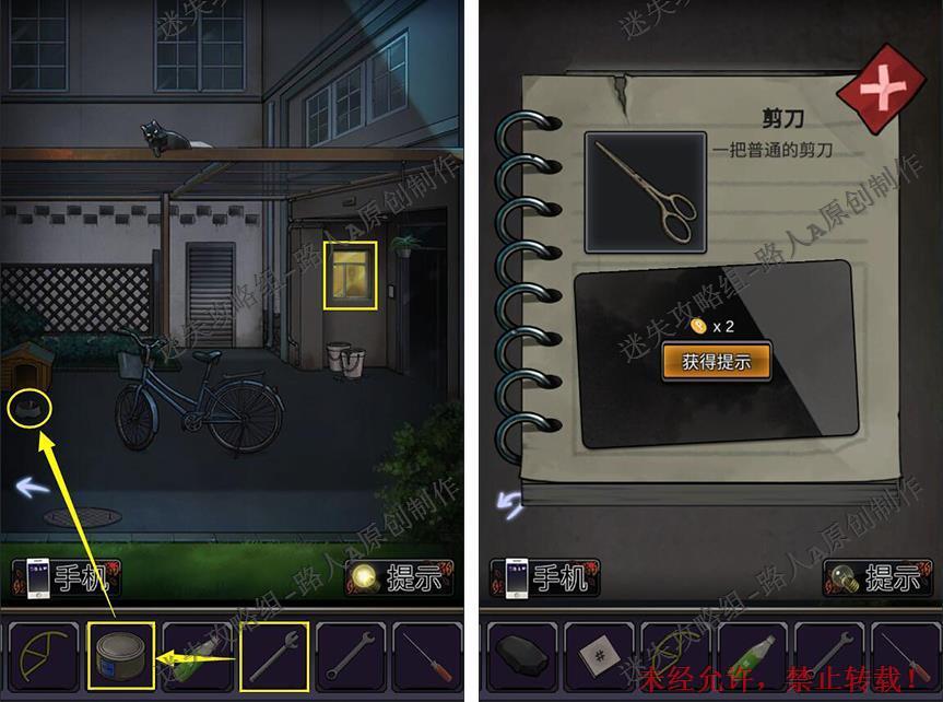 16. 用【开罐器】打开【罐头】,将【罐头】倒入猫食盆,和窗户的人影对话,得到【剪刀】。16.1