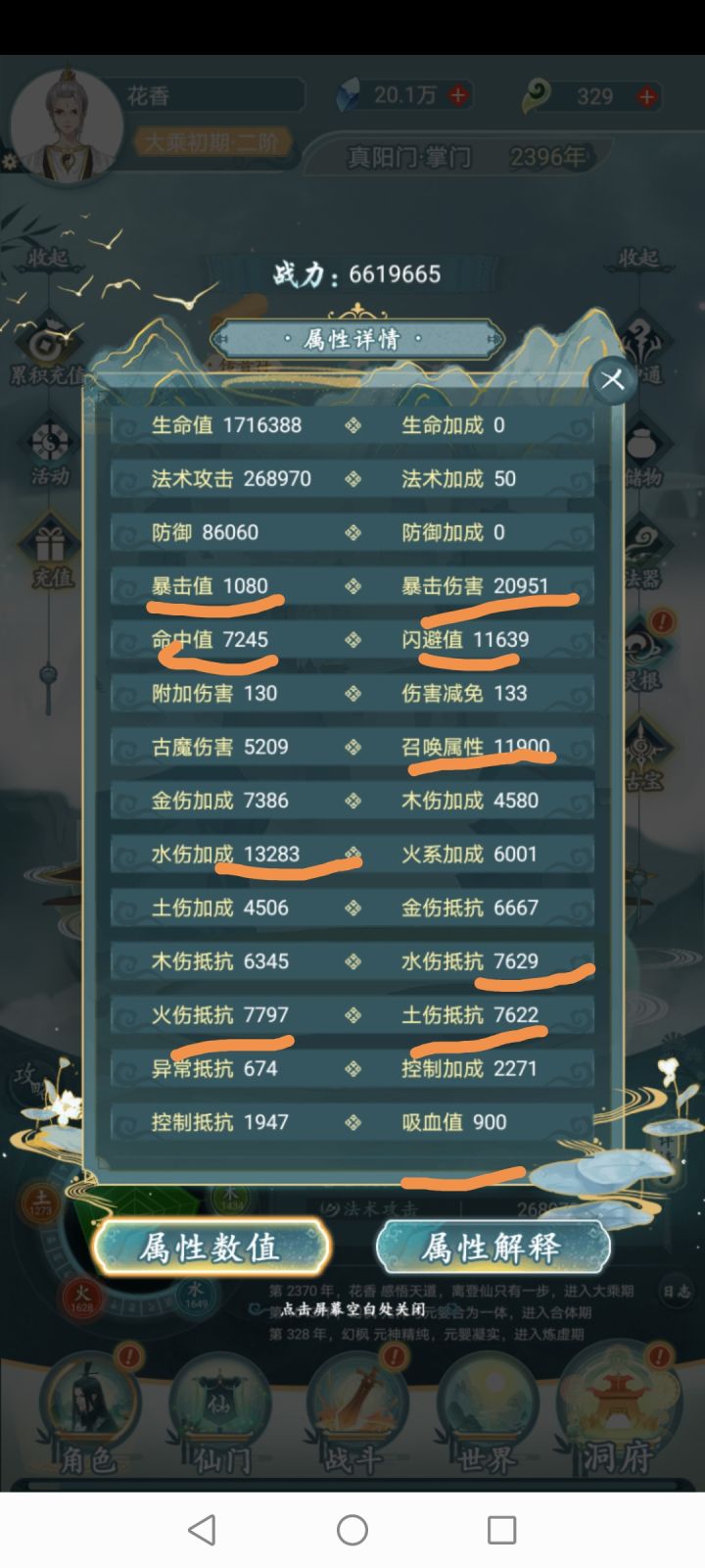 新晋大乘期初二630关卡,灵界基本算通,3分钟单打困兽无压力,直说干货,如图所示,标注了重点属性,(主水系分析)现在告诉大家如何成本最低获得属性,及属性由来,