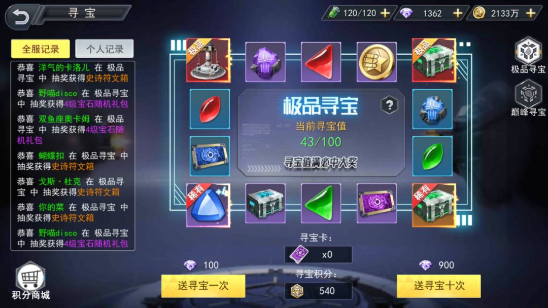 除了寻宝值满时我们会必中的大奖,我们还有寻宝积分商城,相应的积分可以兑换你想要的物品,也就是说,你就算运气再差,不管怎么样,最后你都可以获得你心仪的东西。