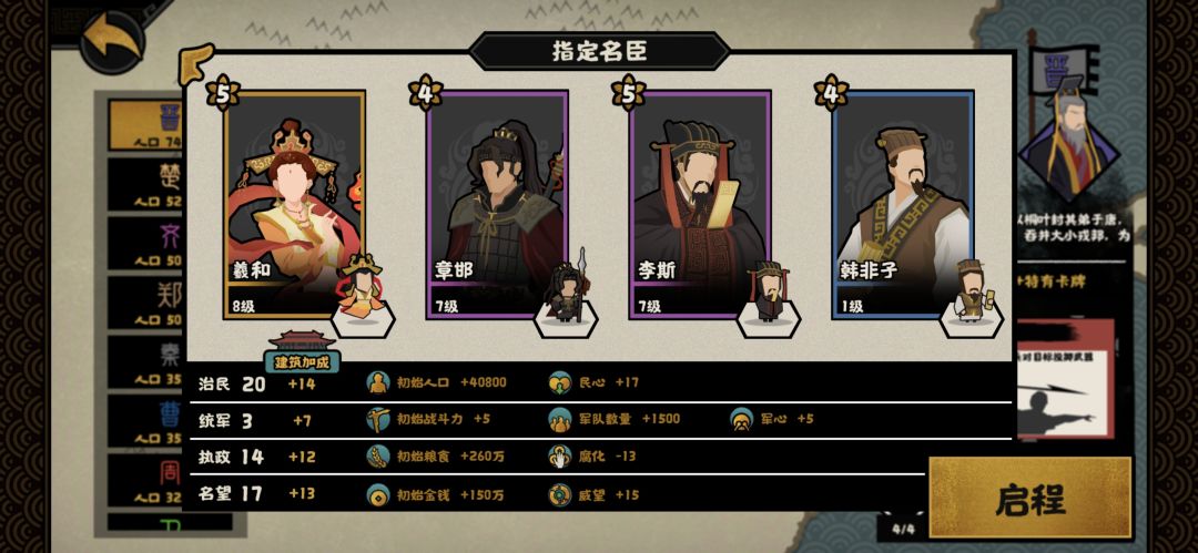 腐化小于20,加20战力(李斯每灭一个国家降5点腐化么快,保证低腐化)。