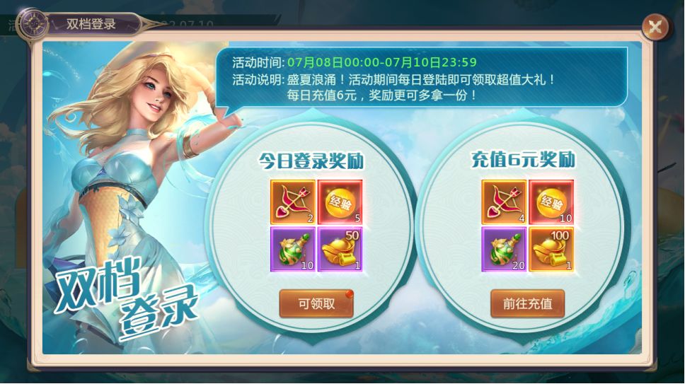 活动期间每天登录游戏可领取一份贴心登录奖励。