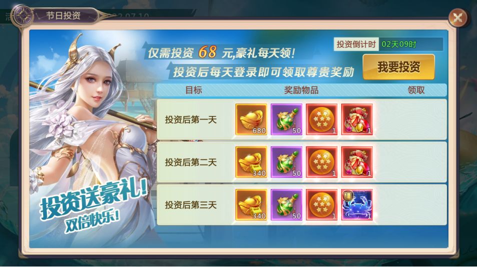 节日期间投资68元,可连续3天领取超级投资大礼。