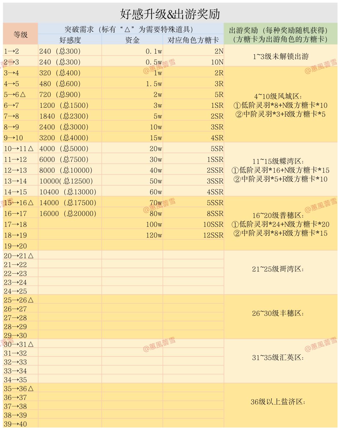 ①首先明白“一口气升”是啥概念:这意味着你的下一个目标不是从11升到12,而是从11升到16,不是要准备6k好感+30w资金+1SSR方糖卡,而是要准备(掏出计算器,看表,无慈悲.jpg)48.4k好感+250w资金+15SSR方糖卡;