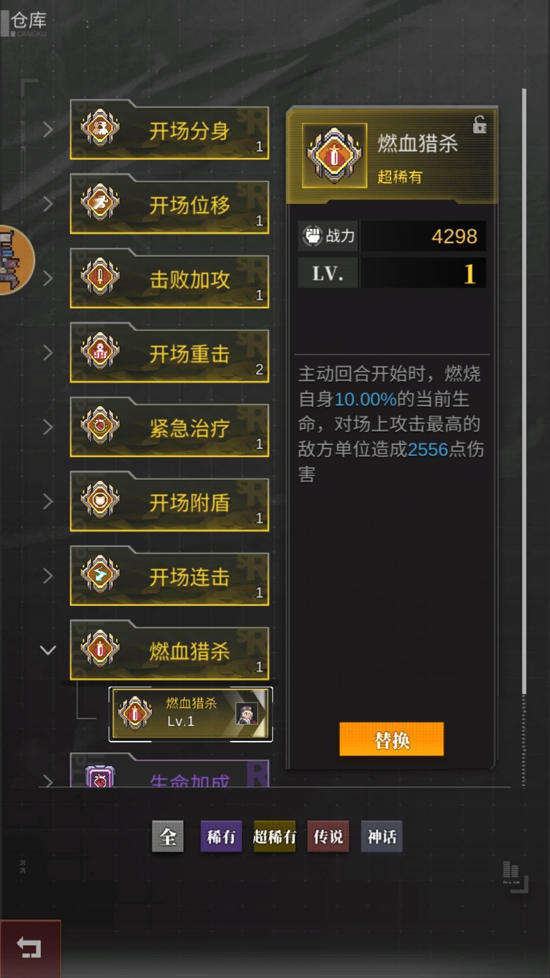 阵容第一位随便一个重复的ssr用上燃血猎杀的核心,通常第一个怪血很少可以直接秒掉。