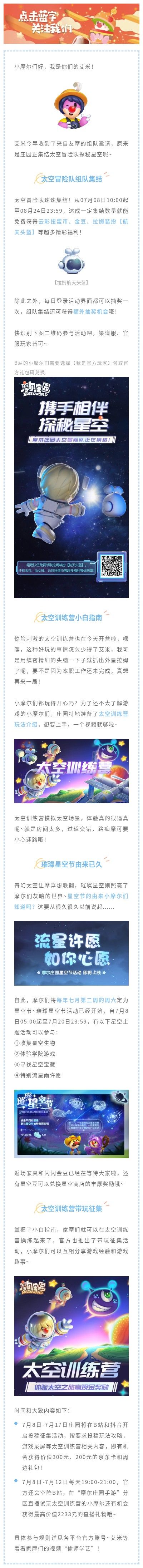 掌握了小白指南,家摩们就可以在太空训练营操练起来了,官方也推出了带玩征集活动,小摩尔们可以互相分享游戏经验和游戏趣事~