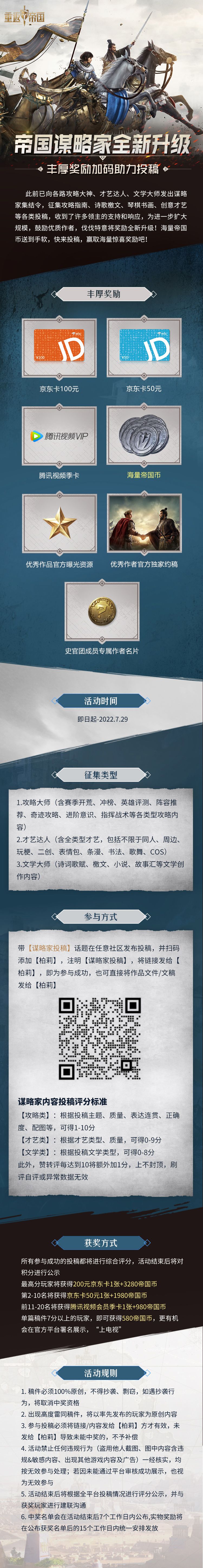 谋略家招募活动经过本次福利升级后,作品成功入选的“大文豪”们不仅能够获得京东卡、腾讯视频季卡、优秀官方曝光资源、官方独家约稿机会还有专属作者名片等专属奖励,还有最高3280海量帝国币等你收入囊中!详情请看↓↓↓