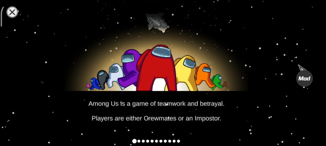 这是一款狼人杀游戏,游戏场景在太空飞船上,游戏开始会有4-10位身着不同颜色的玩家,系统会随机分配给玩家的身份。