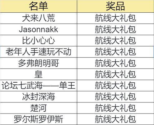 船长们好,开奖时间到啦~ 恭喜以下船长获得活动奖励,请在7天内添加发奖大使QQ (692639596) 领奖,我们将在30个工作日内发奖(如出现添加一天仍未通过可进入发奖大使QQ空间留言,留言内容:活动名称以及中奖人QQ。)