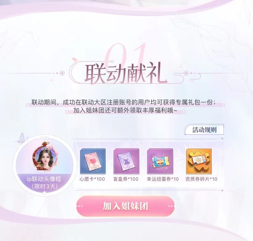 IP联动期间,成功在联动大区注册账号的三小姐都可以获得游戏内送出的联动礼包,该礼包包含限定联动头像框、服饰连抽券、扭蛋券等!