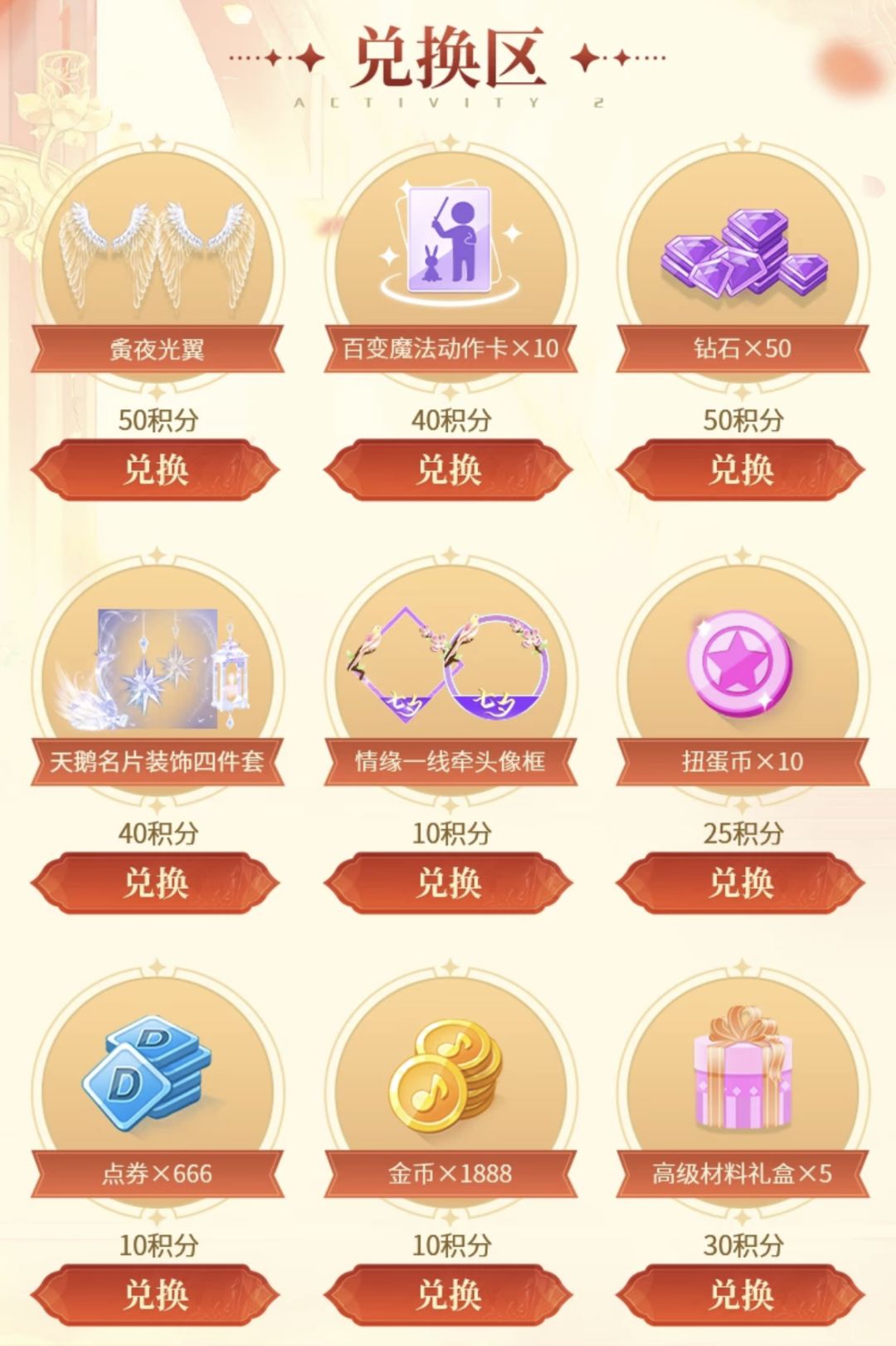 钻石、翅膀、名片装饰、动作卡,头像框、高级材料礼盒、扭蛋币通通可以免费兑换!别再犹豫,现在就来参与叭~