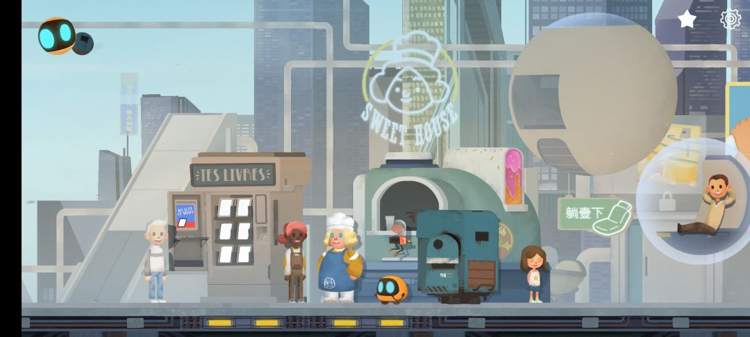第一关,进入大都市之后,先走到最右边,会有一个门,尝试一下打不开,这时候再回去找那个在球球里面的人,他就会给你提要求,要关于猫的杂志和冰淇淋