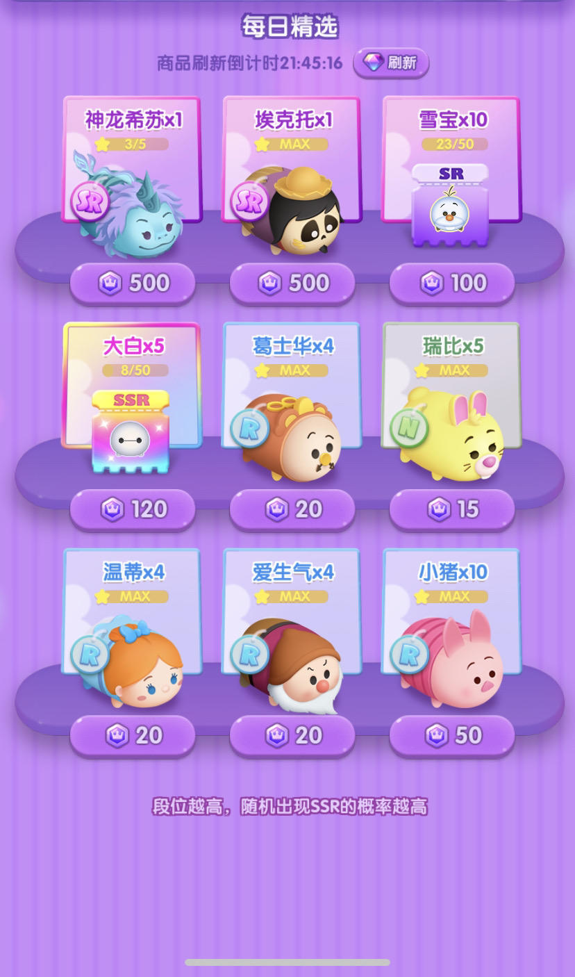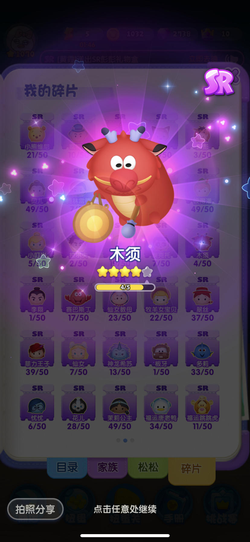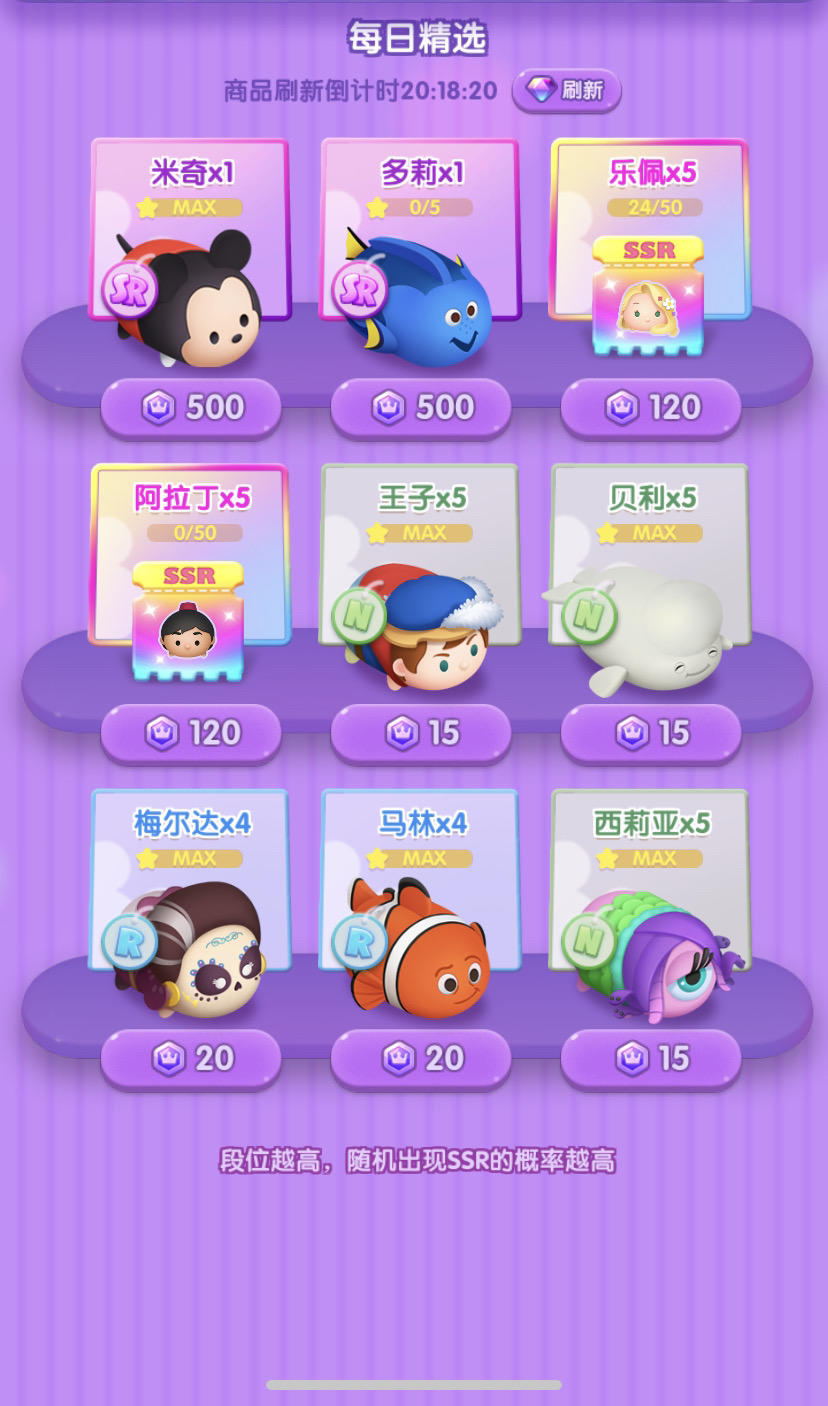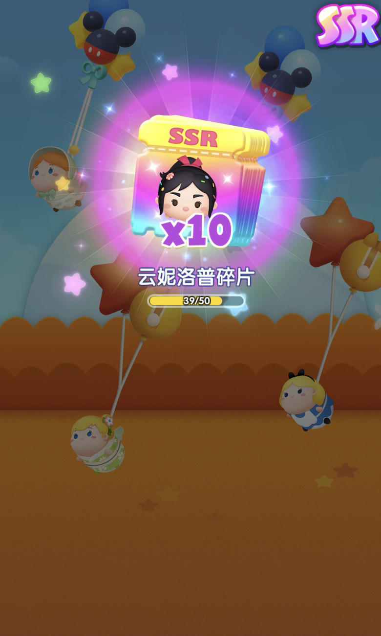 5日份的SSR碎片:爱丽丝x1、艾莎x3、朱迪x3、辛巴x2、野兽x1、云妮x12、毛怪x2、莫阿娜x1、木兰x3、乐佩x1、拉雅x3、胡迪x2、巴斯光年x2、闪电麦昆x1、灰姑娘x1、爱洛x1