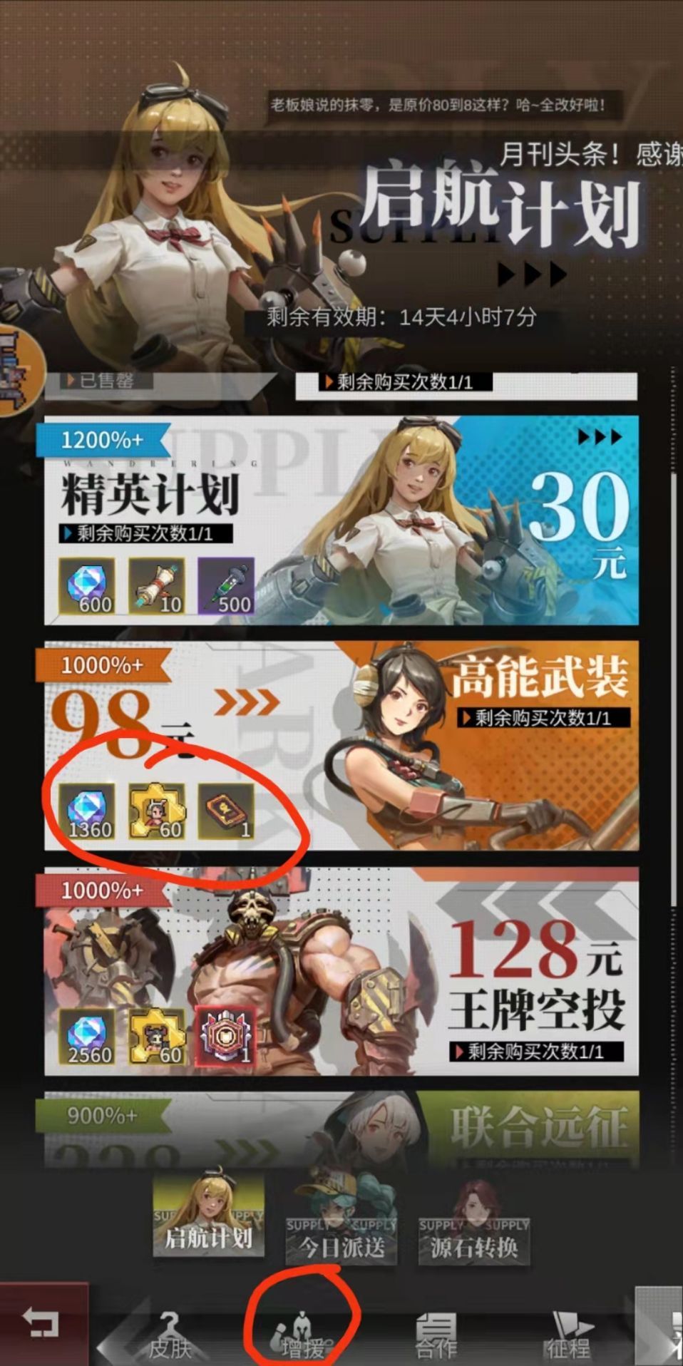 后面钻不够的情况下优先购买3折和派遣券,其他可以停
