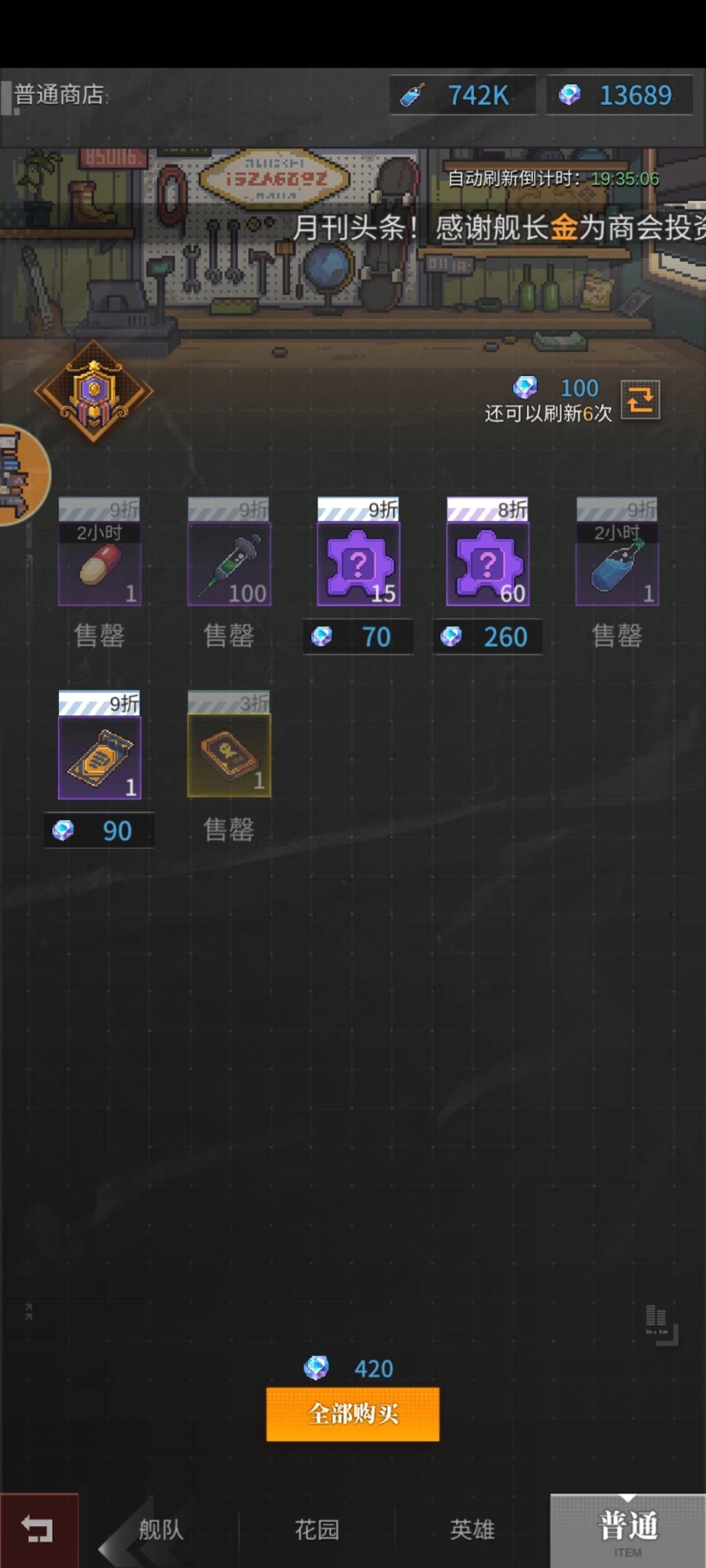 零氪微氪建议一天刷新0次,2次(后期钻不够的话可以不刷),必买项:针管,药丸(前期没钻可以少买或者不买)派遣券,srr金碎片,3折栏(3折栏今天刷新是升级资源的再刷新多少次也不会变成随机srr英雄,直接买就完了)