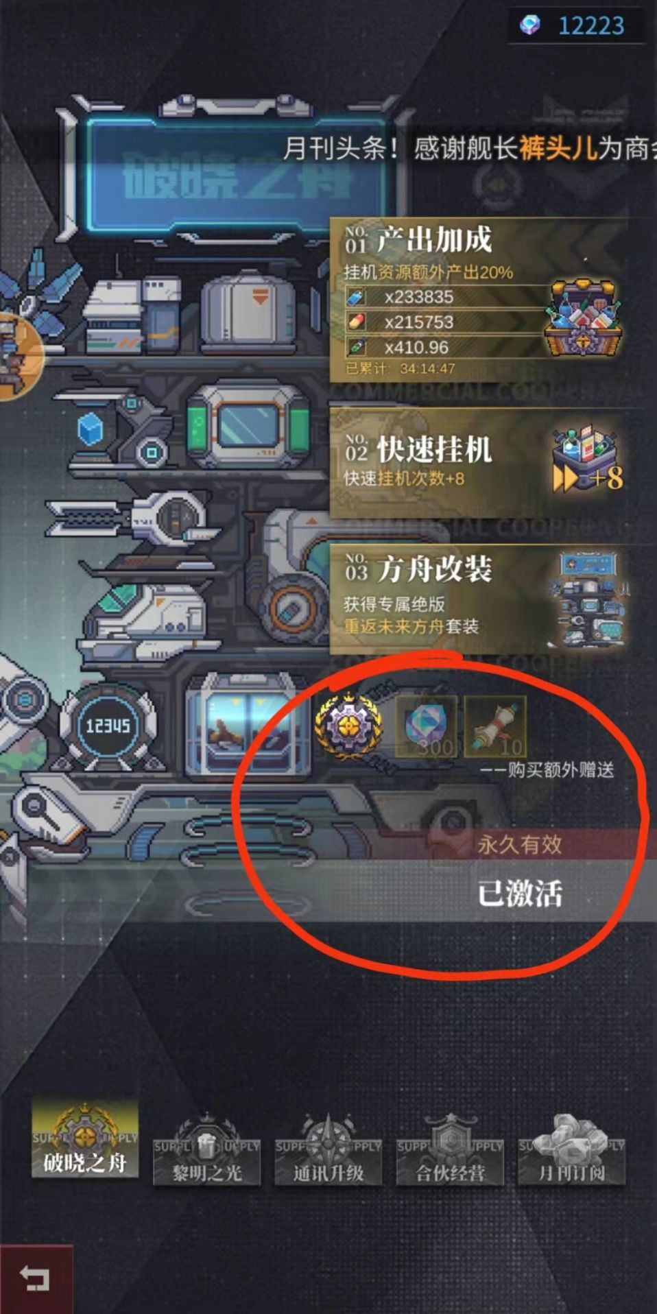 买了破晓之舟的快速挂机可以领额外钻石