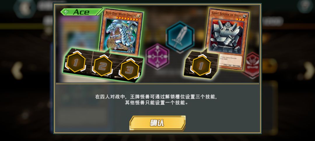 (注意:目前的排位模式里,只有设定的王牌怪兽可以携带三个技能,其余的怪兽无论有技能技能槽都只有第一个技能生效)