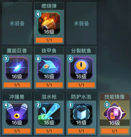 l 【技能镜像】释放后,可双倍之后释放的技能,包括召唤物。按照上述顺序释放技能,场上便会有两只【铁甲鱼】和两只【魔能巨兽】。