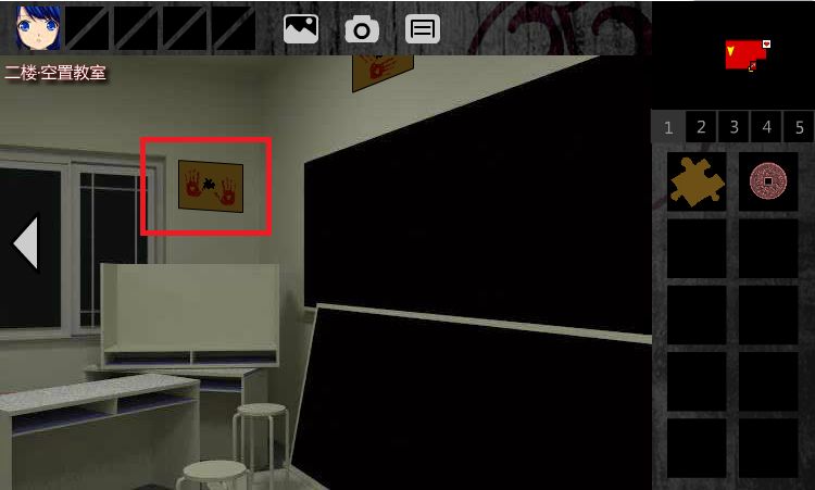 3.后退,右转2次,点击图示红框区域,准备放上【拼图】。触发剧情,小琪传送到2F•高二(2)班课室。