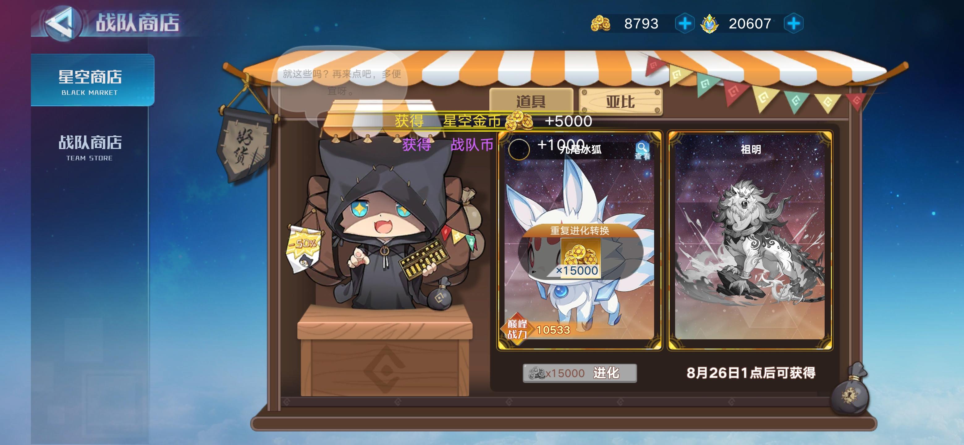 重复契约九尾冰狐契约会补偿消耗的5000星空币,额外赠送1000战队币