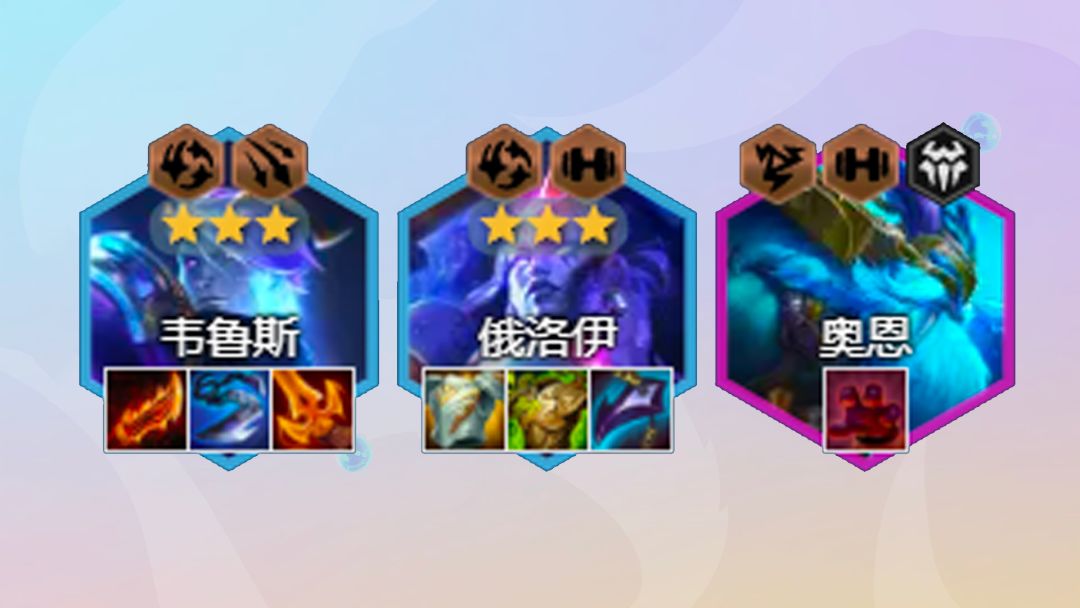 主C维鲁斯:鬼索的狂暴之刃+巨人杀手+死亡之刃主坦俄洛伊:巨龙之爪+石像鬼石板甲+狂徒铠甲副坦控制奥恩:窃贼手套装备解析:主C维鲁斯的装备鬼索的狂暴之刃一定要有,不然攻速太慢了,巨人杀手再打高生命值坦克是不会刮痧,保证输出,最后补一个伤害装死亡之刃增加攻击力,无尽之刃也行。主坦俄洛伊吃格斗家羁绊,石像鬼是板甲叠加护甲和魔抗性价比很高,保证坦度属性,狂徒铠甲撑血量可以站很久,最后补一个龙爪,由于当前法师太多,没有龙牙还是容易被秒。副坦奥恩:拳套太多了可以做窃贼手套,有时候运气可以偷凌风、静止法衣等好装备,偷到肉装收益也很高。