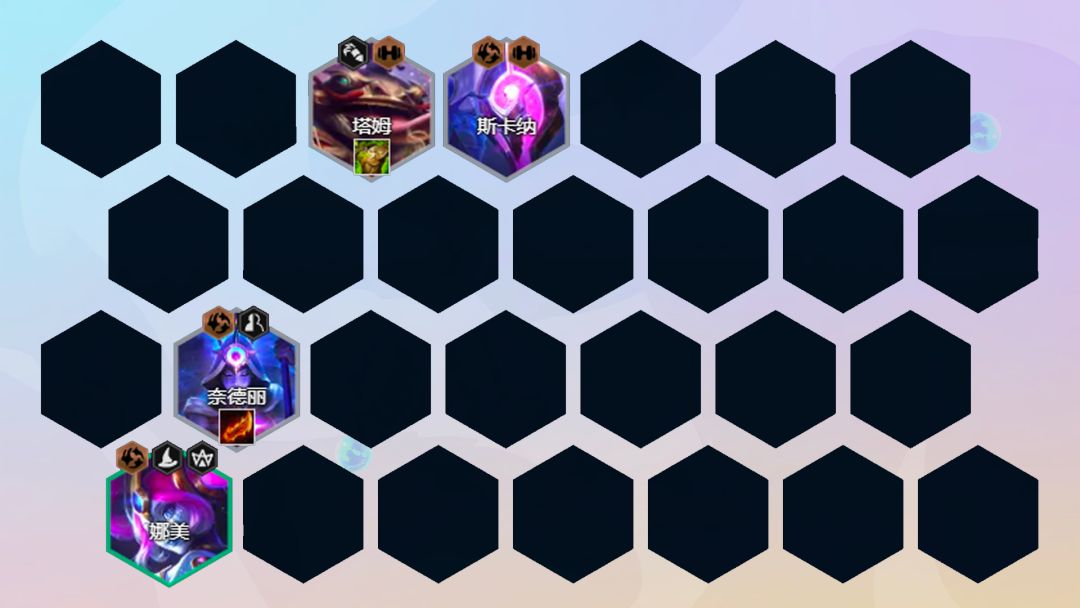 2阶段:2-1升4人口,2-5升5人口。前期蛤蟆、斯卡纳、奈德丽、娜美打工过度,5人口可以不上纳尔给豹女凑两换形师,俄洛伊装备给蛤蟆,维鲁斯装备给奈德丽,这个质量羁绊前期很强,2阶段一直到打完野怪结束。