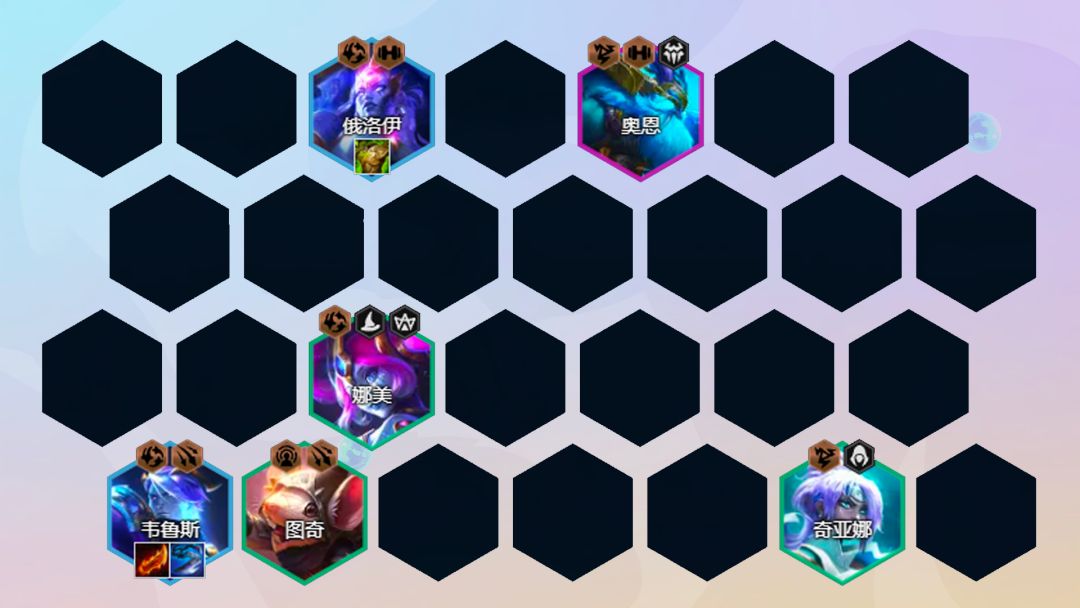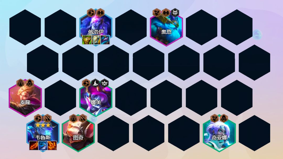 阵容组成:俄洛伊、奥恩、泰隆、维鲁斯、图奇、娜美、奇亚娜、巴德阵容羁绊:3冒险家3星界龙2刺客2格斗家2秘术2迅捷射手2风暴龙转职推荐:冒险家纹章 射手纹章