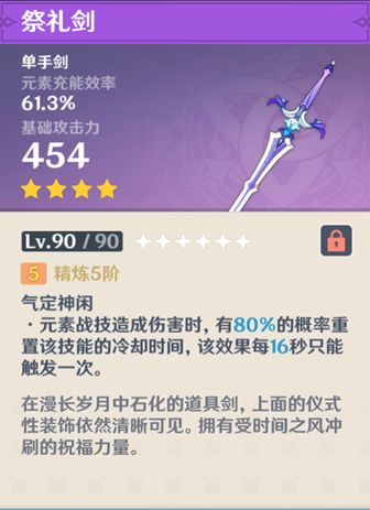 再看特效——祭礼剑是e造成伤害有概率刷新e的CD (精炼缩减这个特效的内置生效CD);西风剑造成暴击以后出3颗白球,每颗回2能量(注意这个球是吃角色充能效率的 也可以切别的角色前台吃);铁蜂刺是一个可叠两层的角色本体增伤。