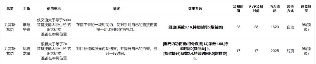 太极拳:信仰流武学,目前版本唯一意义即作为九霄斩龙功的前置武学需要练到400级,无技能武学。