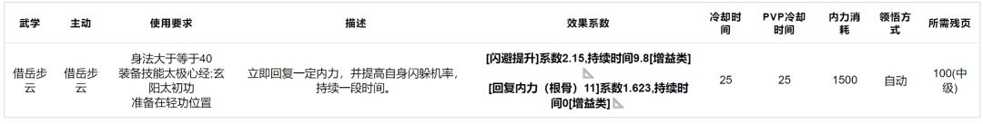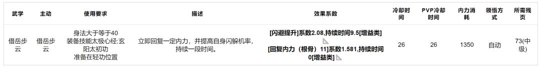借岳步云:系数偏低,但技能增幅的闪避与续航在经过加强后勉强可以使用,中级武学。
