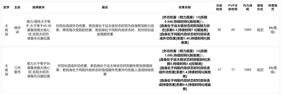 太极剑:效果如下,配合门内效果不错,技能重数提升优先级中上。
