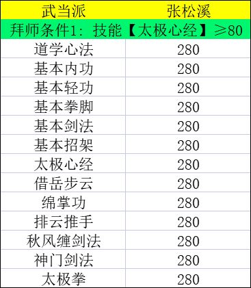 【太极拳】: 技能【太极心经】≥100级、技能【绵掌功】≥100级、属性【内力上限】≥250