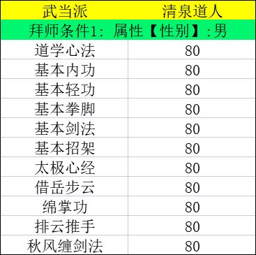 【太极剑】: 技能【太极心经】≥100级、技能【神门剑法】≥100级、属性【内力上限】≥250