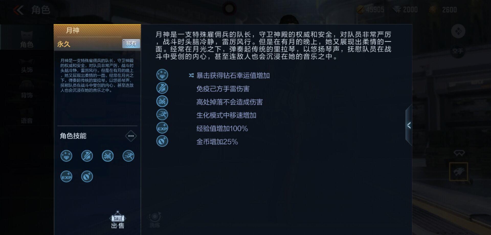属性方面,月神基础属性中有免疫己方手雷伤害、高处掉落不受伤害这两条实用属性,生化模式中也有移速增加,同时还能洗练一条属性,洗练属性中有着两个顶级属性可供我们选择:冲锋枪切枪速度提升15%;增加团队成员主弹夹子弹数+1!