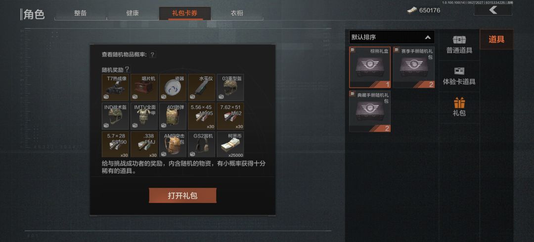 这里是礼包卡劵就是你做任务或者活动和充值送的礼物盒奖品都很不错至于能获得什么东西就看脸了,也有自定义选的比如基础子弹这些你可以根据你使用的枪械进行选择。