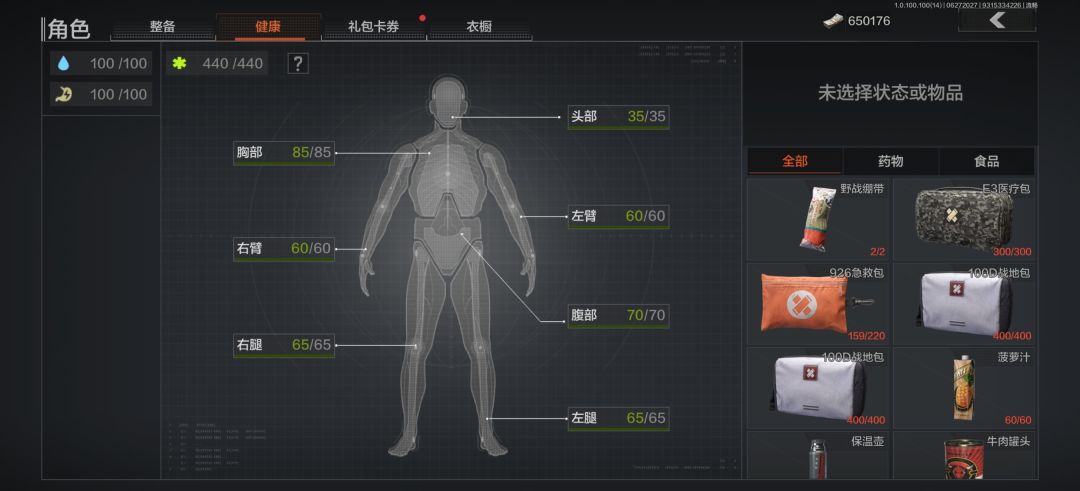 这里是人物健康面板左边是水量和食物和塔科夫一样在游戏里你的食物和水量会随着时间的推移开始减少,所以推荐当老六的玩家可以进图的时候带点水和食物进图。这里你在游戏里受伤打药也是消耗水量的所以钢枪的小伙伴们也要注意这一点哦