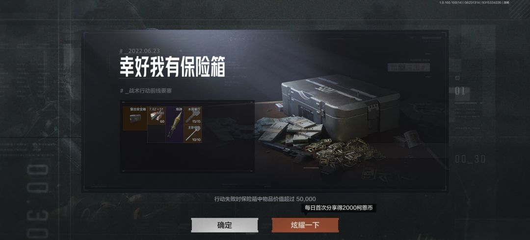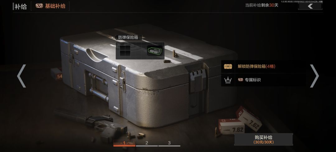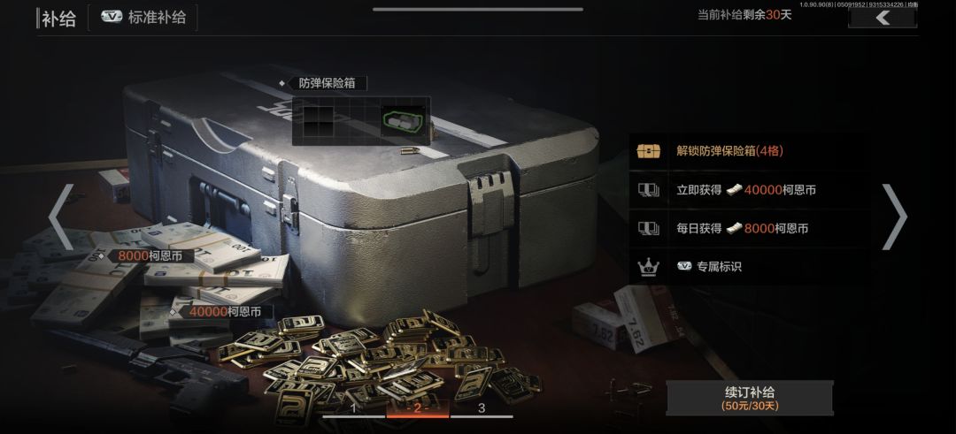 这里是刚才说的月卡,也就是补给为什么要详细说这个呢,主要是因为有保险箱家人们,保险箱什么概念那可是这游戏最良心的设定了,你想你消耗了钥匙开了一个价值五百万的情报准备撤离突然被人噶了。什么东西都没有你想想。是不是很气人所以保险箱这东西简直就是护身符你开了好东西往里一放,哪怕你死了保险箱的东西也能带出来。所以很适合各位小伙伴们的。这里条件好的可以买128六格子的,毕竟好东西能放的越多越好嘛不是。