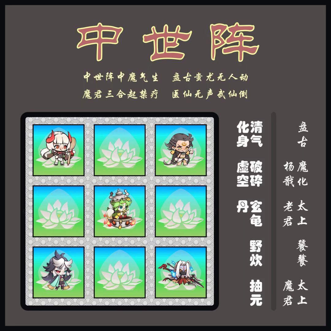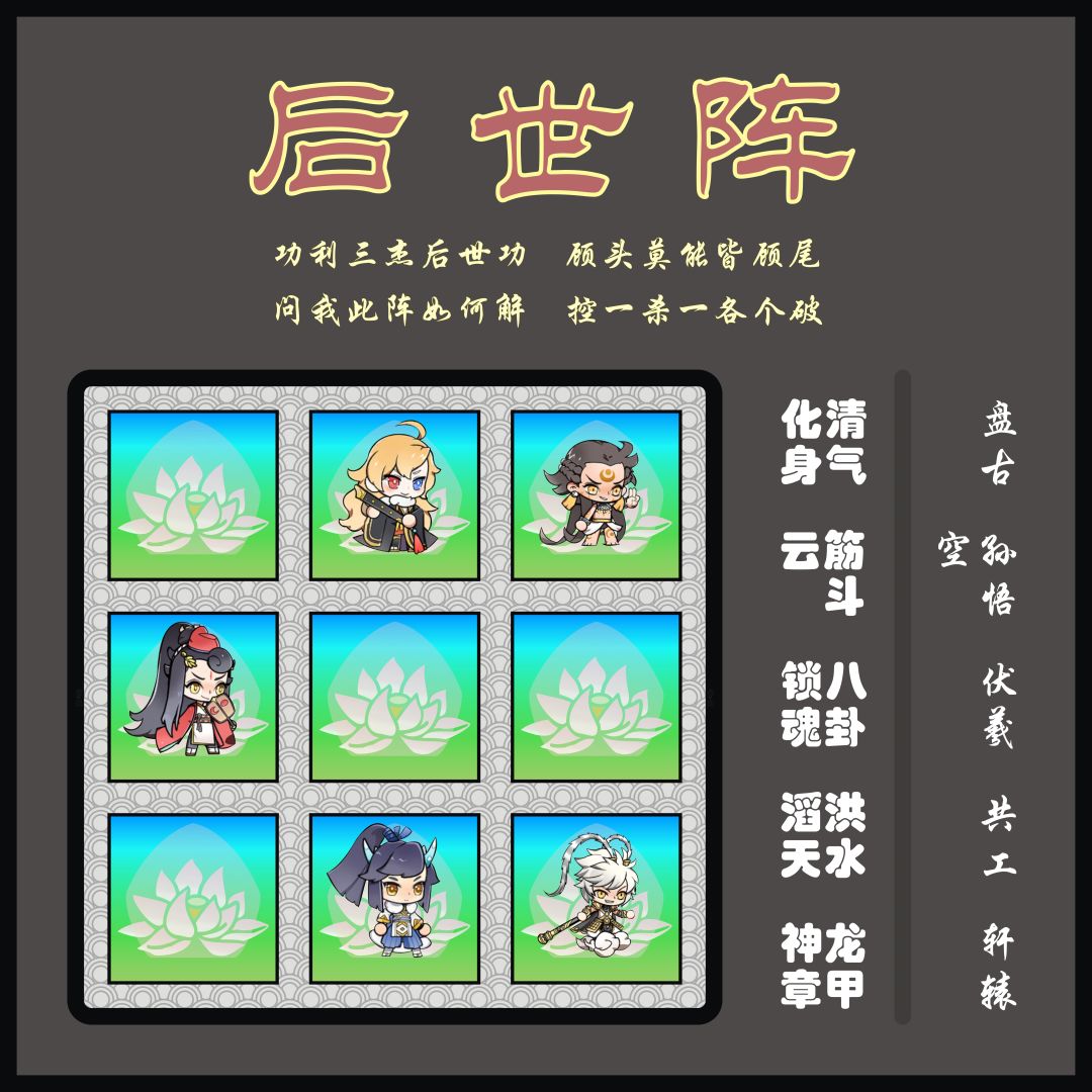 后世阵是从我回坑后到最后关服所总结的最BUG级阵容,所谓“功利三杰”就是指孙悟空、伏羲、共工,这三个都是出道即巅峰,巅峰还能到最后的三位仙人。而且此阵往往是后期双人试(神)炼(通)的最强参战阵容,所谓遇神杀神遇佛杀佛应该就是如此。如果双方真人撞上了,就看谁的牌运好了。