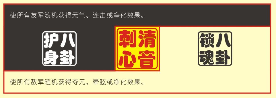 轩辕,由于其主要用于轩武阵,所以会在之后的轩武阵中细说。这里说两点:1.“令牌”在双人组队时,如果给队友武仙使用,且友方满卡牌时就会消失掉,所以双人组队时使用一定要看好友方的牌数;2.此阵轩辕的主要作用在于,第一回合让猴子守备,这样盘古冲锋后顶住敌方上、中武仙把下方武仙放出来,即可集火输出敌下方武仙,还可对猴子进行保护。所以见到轩武阵时,一般从开始就博弈起来了。