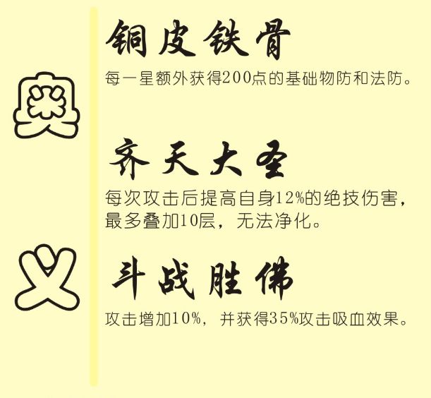 孙悟空,作为最后出的一个仙人,绝对是技压全场的降临。其奥义我放在了下方,可供参看其可怕的加成。一般四、五回合后的猴子,只要放绝技,就连柳岸盘古都扛不住。虽然这次公测已经暂时删除了此仙人,但作为历史的产物,还是要说一说使用感悟的。首先每次攻击都可以不被净化的增加此后的绝技伤害,所以开局有连击就无脑给猴子,如果太欧了,直接第一波绝技就能收获几个人头。再说卡牌,常用1卡,容易被忽略的两点:1.每次使用均会叠一层齐天大圣buff;2.绝技后可重复获取该卡牌的buff是可以被净化的,所以攻方要注意使用时机,守方可以留净化等着对方疏忽大意,切断其重复获取。最后说下两套针对的方案,一套是让猴子永远放不出绝技,一套是让猴子快速放第一轮绝技然后让他用于放不出第二轮绝技,所以如何运用“晕眩”及“夺元”类卡牌,就是你如何制约猴子的所在。