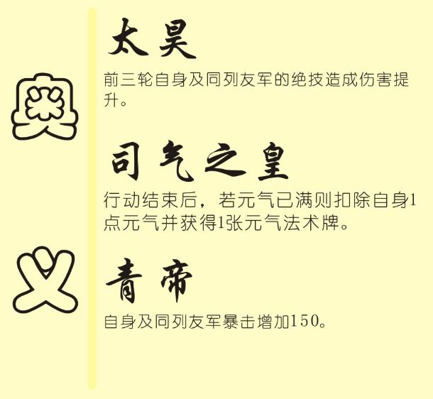 伏羲,同样是被删除的四个仙人之一,我把奥义和卡牌先放下方。伏羲+共工组合,在我回坑后一直霸道到最后大合服遇到了轩武阵才慢慢退出1V1的舞台。伏羲能奶血奶气还能打,更主要的是他的奥义1“太昊”,往往与共工一起同轮在第二、三回合就来一波“后排消失术”。双卡牌卡一为攻卡二为守,都可以无脑随意使用。奥义2也可作为元气储备,在3回合后积累元气牌择机而动。至于奥义3,等后边有个阵法会专门再说。