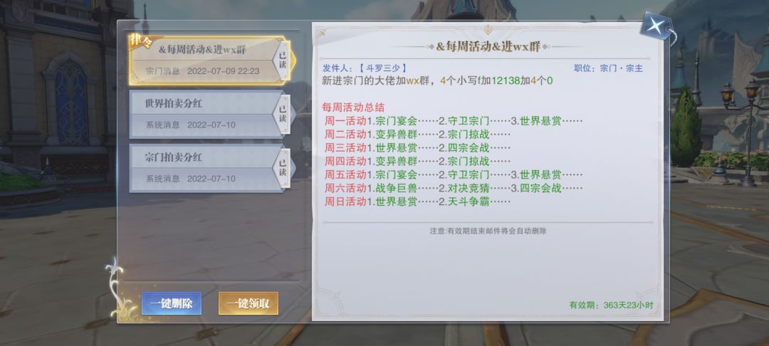 宗主是一个非常好的人,他花一段时间整理宗门一周的活动来发宗门律令,让新手参加活动可以知道时间,不那么急躁,他也会指挥我们打天斗争霸,四宗会战之类的活动,很有宗主的风范。宗门里的人都是非常好的,每个活动都是积极讨论,该如何去做好这个活动。当新手问如何进行阵容搭配时,会有会玩的一些玩家耐心教导,来帮助新手玩家更好的玩这款游戏。我感觉我的宗门就是最好的,最强的,有活动一起上。认识了不错的小团体,这至少在以后都是一段不错的记忆,像一个大家庭一样互帮互助。希望我的宗门会越来越好,希望这款游戏也越来越更上一层楼。