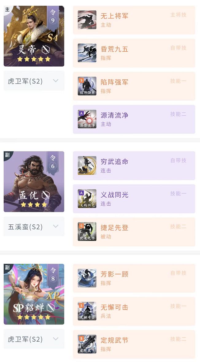灵帝队的武将门槛很低,满红孟优基本没有难度,第三武将可选范围大,常用的高顺、荀彧、SP典韦甚至SP貂蝉都可以使用,技能门槛也比较低,没有特别难获取的武将拆技。