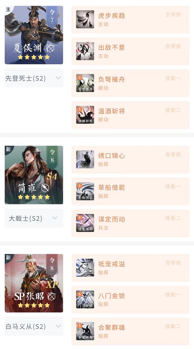 武将获取都比较容易,无SP张昭可用张辽替换,主要是技能门槛较高,需要大量典略技能来堆叠增伤,可替换性很低,减少一个增益都会降低队伍表现。