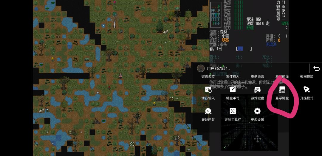 3、功能里面找到悬浮窗口打开,点开键盘下面的准星,调节里面可以调整透明度和大小,建议换一个黑底白字的输入法皮肤。