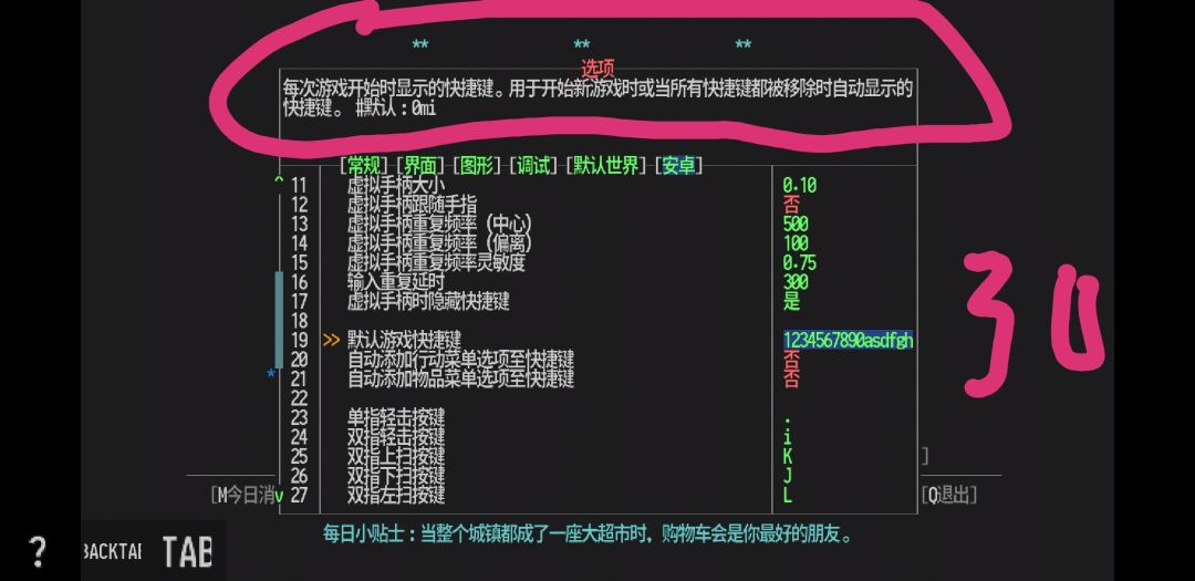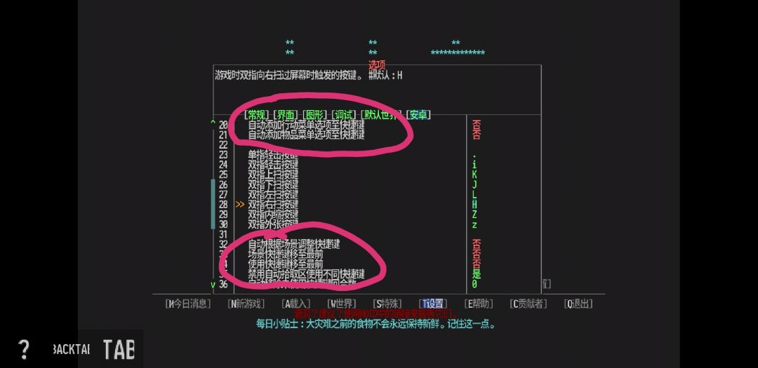 选项→安卓→默认游戏快捷键。这里可以设置三十个默认的快捷键,然后就变成了图上那样,可以选择关闭或者不关下面这些选项。选项→安卓→自动添加行动行动菜单至快捷栏、自动添加物品选项菜单到快捷栏、自动根据场景调节快捷栏、场景快捷键移到最前、使用快捷键移到最前、禁用自动拾取区使用不同快捷键。