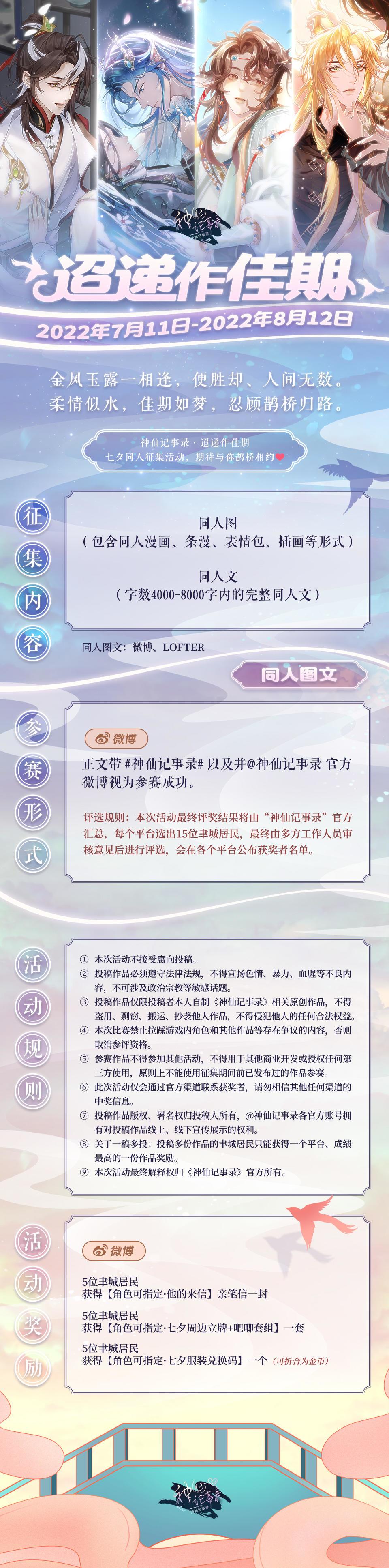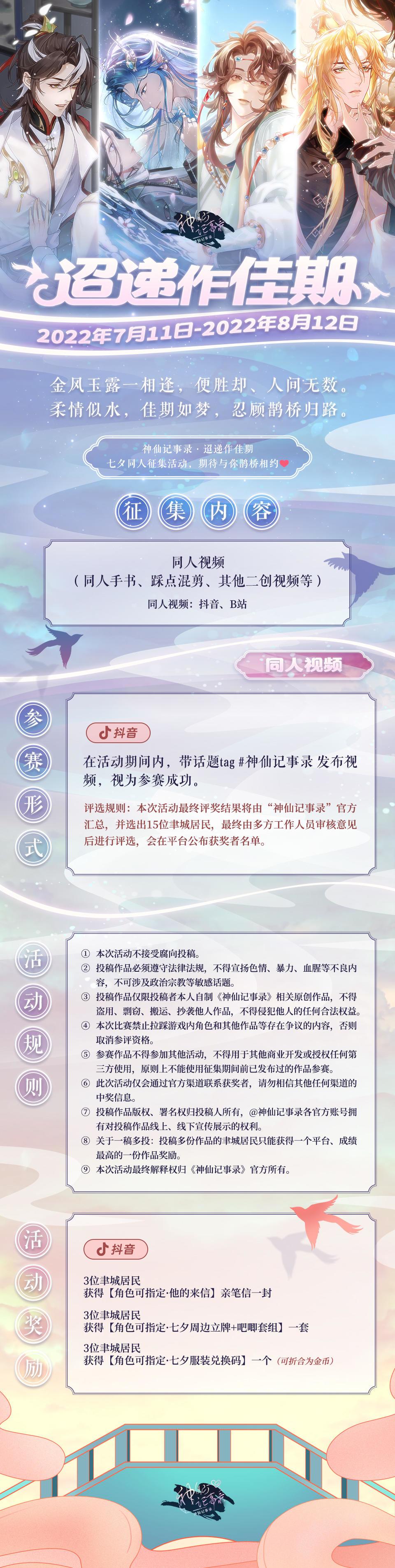 神仙记事录 七夕版本·迢递作佳期 主题七夕同人征集!微博、B站、lofter、抖音,四个平台均可参与,有机会获得【他的亲笔来信】与【梦魂萦鹊】七夕限定周边、限定服装兑换码奖励!